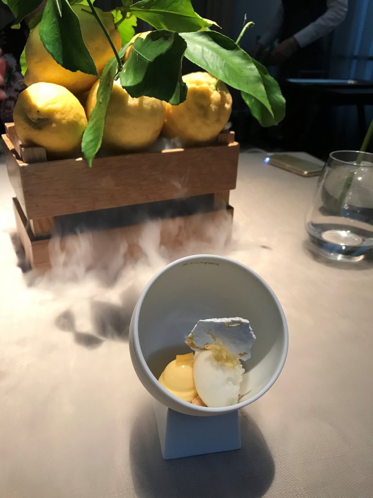 ก่อนจะไปของหวาน จะมีการดึงประสาทสัมผัสโดย นำกระถางมะนาวที่ด้านล่างใส่น้ำแข็งแห้ง ราดน้ำร้อนลงไปให้กลิ่นหอมของมะนาวและ ความเย็นกระจายทั่วโต๊ะ กระแทกประสาทสัมผัสของเราทันที ขณะที่เสิร์ฟเชอร์เบทมะนาวมาตรงข้างหน้า ขอปรบมือให้เชฟจริงๆว่า งานศิลปะชิ้นนี้กระตุ้นทุกประสาทสัมผัสได้ราวกับดูคอนเสิร์ตจนถึงจุดไคลแมกซ์