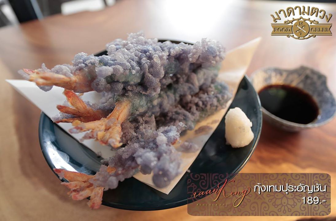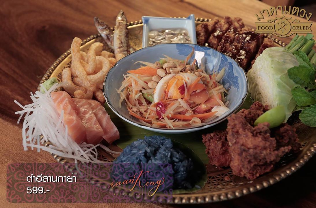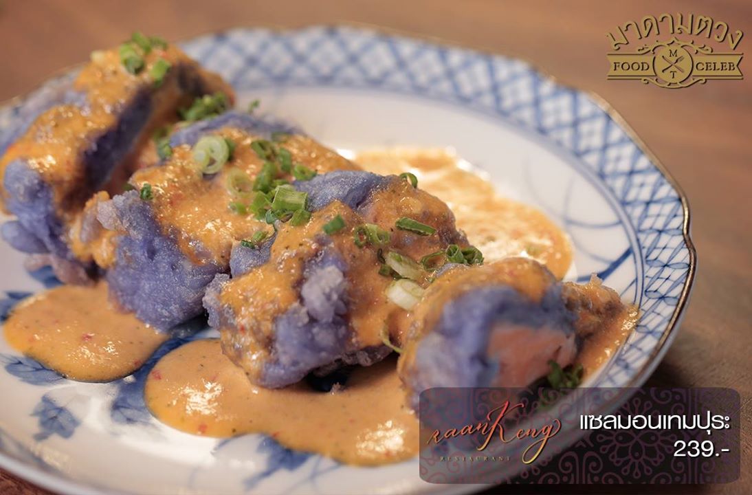 แซลมอนเทมปุระจานนี้เป็นแป้งหุ้มเนื้อปลา คล้ายๆ ข้าวปั้นซูชิไส้ปลาแซลมอนและซอสสีส้มตัดกัน ในส่วนซอสรสต้มยำน้ำข้น ให้รสชาติจัดจ้าน ไอเดียเก๋มาก อีกเมนูหนึ่งที่สั่งกันแทบทุกโต๊ะคือ ตำอีสานกาย่า เป็นจานออเดิร์ฟรวม มีปลาแซลมอนดิบ แคบหมู ส้มตำตรงกลางสามารถเลือกตำแบบไหนก็ได้ตามชอบ หมูทอดทงคัตสึ ปลาไข่จากญี่ปุ่น ข้าวเหนียวนึ่งกับดอกอัญชันสีม่วงสวยงาม