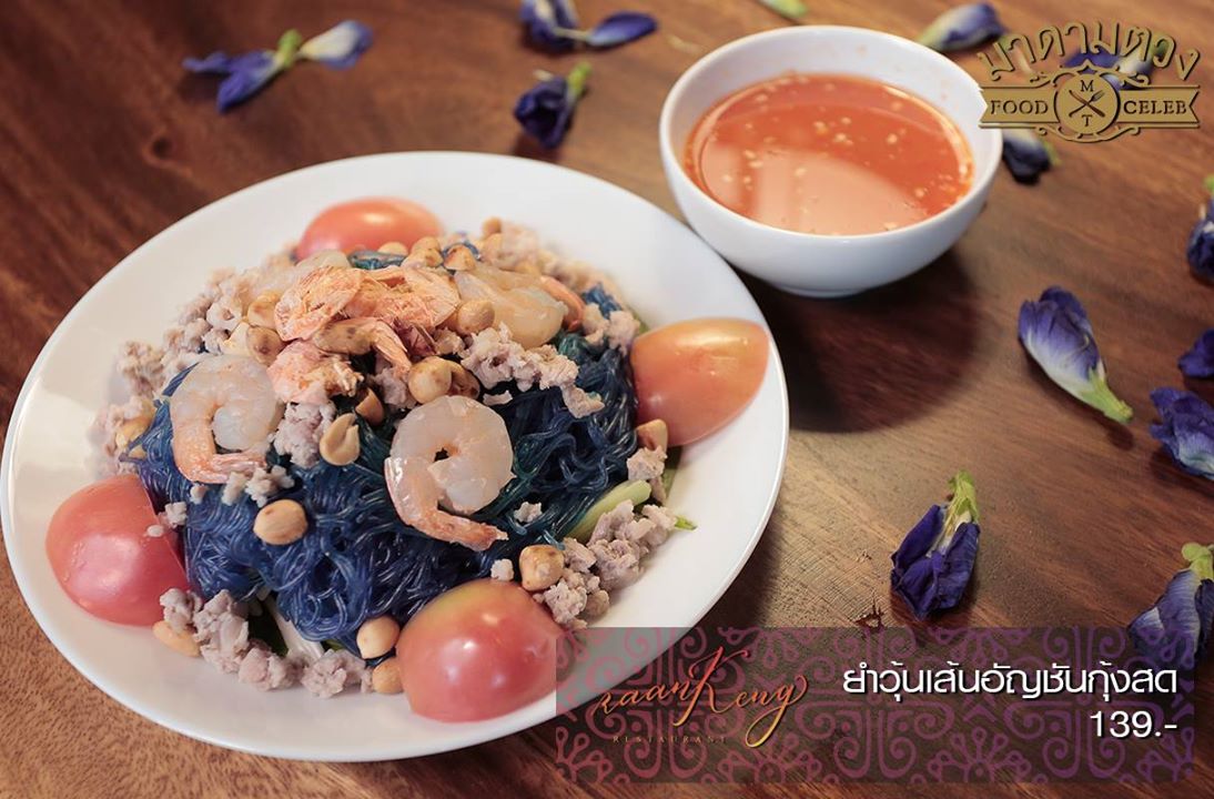 ส่วนในเรื่องของอาหารของร้านนี้ เป็นแบบ Isankaya โดยได้ไอเดียจากแบบ Izakaya ของญี่ปุ่น ที่มีอาหารแบบกับแกล้ม ร้านนั่งดื่มที่คนญี่ปุ่นมักไปหลังเลิกงาน อาหารจะเป็นการผสมผสานไทยและญี่ปุ่นโดยในซิกเนเจอร์เมนูมีแกนธีมสีน้ำเงินจากดอกอัญชัน เช่น กุ้งเทมปุระอัญชัน เมนูนี้ได้รับการตอบรับเป็นอย่างดีเนื่องจากกุ้งเทมปุระตามแบบที่คุ้นเคย แต่มาในแบบสีน้ำเงินที่เกิดจากการผสมแป้งทอดกุ้งกับสีของดอกอัญชัน หรืออีกเมนูหนึ่งที่ให้ความแปลกตา และ ได้รับความนิยมในการถ่ายรูปจานนี้มาก ยำวุ้นเส้นอัญชันกุ้งสด รสชาติจัดจ้านครบรสเปรี้ยวเค็มเผ็ดสมเป็นยำวุ้นเส้น