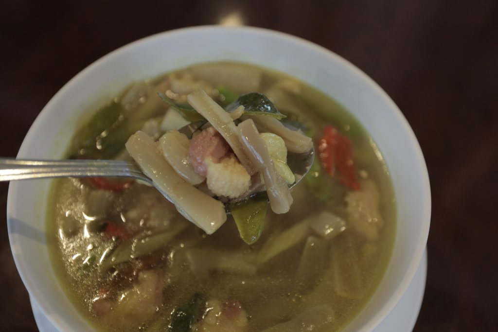 ต้มหนางหมู140 บาท จานนี้คล้ายๆแหนมหมูเป็นของคนใต้แท้ทำจากหนังหมู รสเปรี้ยวได้จากการหมักเช่นเดียวกับแหนม เป็นอาหารใต้แท้ที่หาทานยากในกรุงเทพ