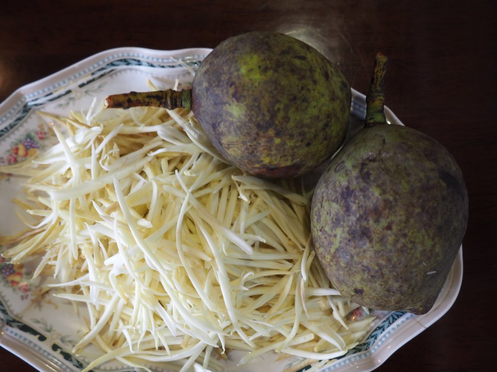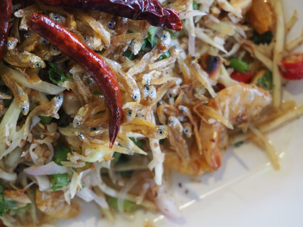 อีกเมนูที่น่าทาน คือ ยำลูกมุดปลาข้าวสาร130 บาท ลูกมุดคือพืชท้องถิ่นเช่นกันรสเปรี้ยวคล้ายมะม่วงแต่มีกลิ่นเฉพาะหอมคล้ายๆข่า นำมาซอยเส้นเล็กๆคลุกเคล้ากับเครื่องยำต่างๆ โดยเฉพาะปลาข้าวสารตัวเล็กๆ ทอดกรอบๆทานเพลิน