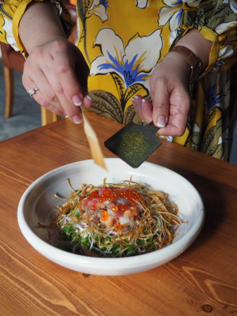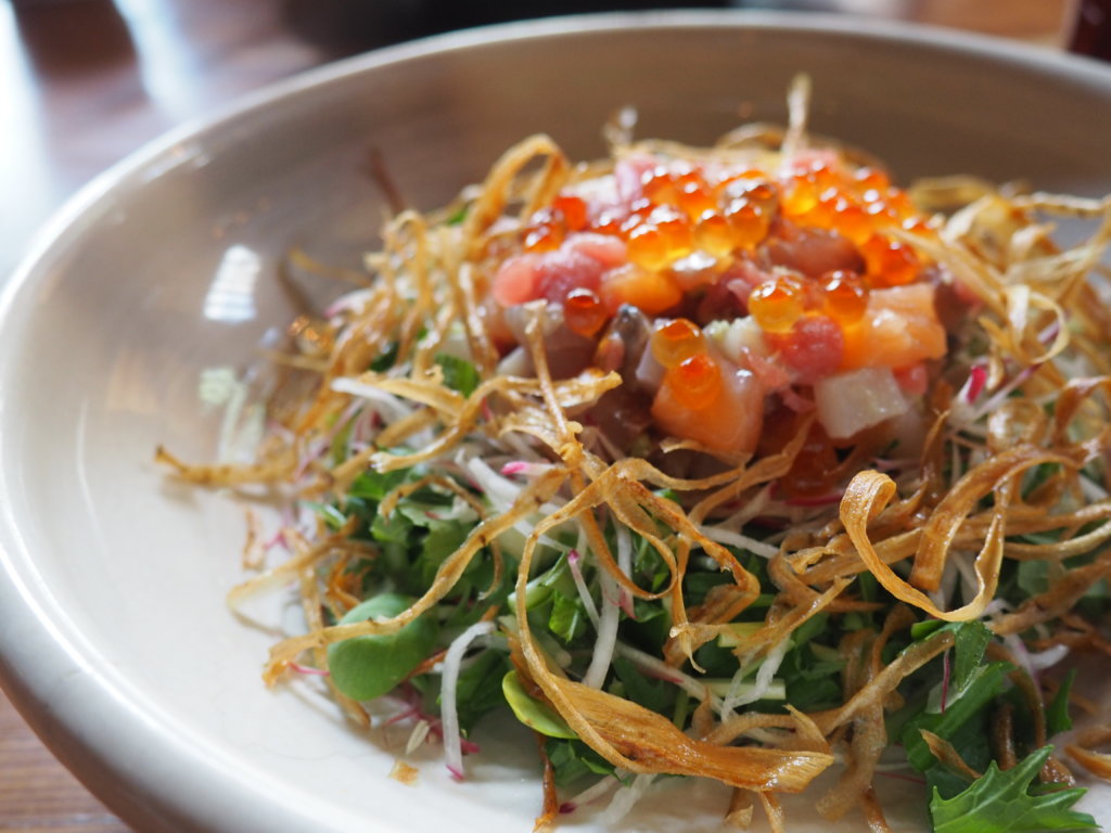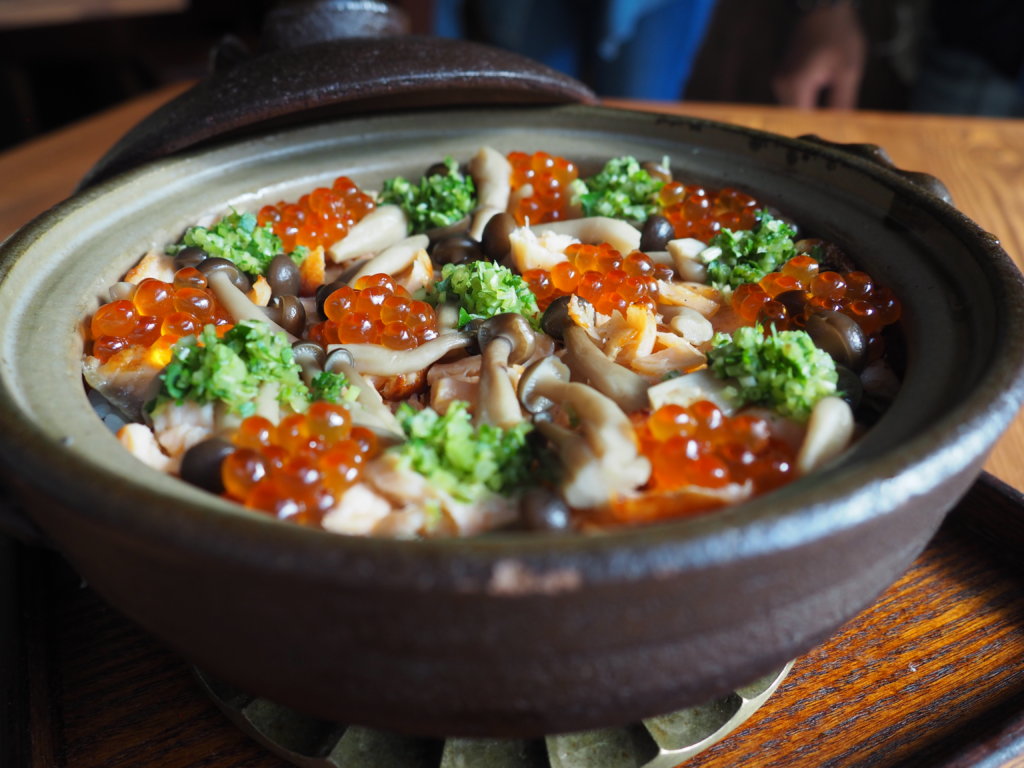 เมนูสลัดเรียกน้ำย่อย ชื่อว่า Sashimi Chopped Salad สลัดปลาแซลมอน 380.- น้ำสลัดรสชาตืไม่เหมือนที่ร้านไหน รสชาติเค็มกลมกล่อม หอมน้ำมันงา แต่ไม่เปรี้ยว ปิดท้ายด้วย ข้าวอบหน้าแซลมอนและไข่ปลาแบบญี่ปุ่น Salmon and Ikura Danabe Gohen 790.- ทานได้ 4 คน เมนุนี้ค่อนข้างใช้เวลาประมาณ 40 นาที แต่อร่อยสมกับที่รอ ข้าวญี่ปุ่นอบมาในหม้อดินหอมฉุย มีเนื้อปลาแซลมอนและไข่ปลาตกแต่งอย่างสวยงาม