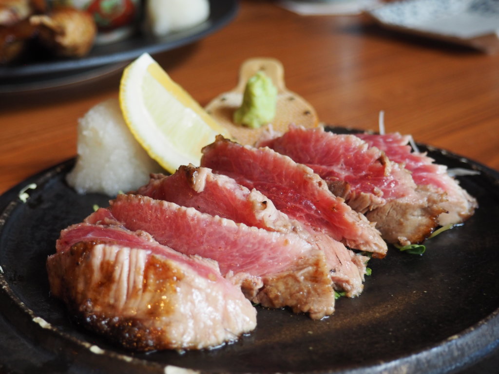 เมนูเนื้อวัว ทางร้านใช้เนื้อวัวที่ชื่อว่า Ibaraki Hitachi ซึ่งเป็นเนื้อวัวสายพันธุ์เดียวกับเนื้อโกเบ เพียงแต่เลี้ยงอีกเมืองหนึ่งซึ่งเรียกชื่อตามชื่อเมืองนั้นๆ ที่ร้านมีเนื้อวัวทำสเต๊กให้เลือกหลากหลายชนิด Ibaraki Hitachi Wagyu Sirloin Steak (สเต๊กเนื้อวากิว) (1,990.-) จานนี้เป็นที่ลูกค้านิยมมากที่สุด เนื้อคุณภาพดีมากๆ มีไขมันแทรกเป็นลายหินอ่อนสวยงาม เนื้อนุ่มละลายในปาก กลิ่นความหอมของเนื้อเวลาย่างมายิ่งทำให้ทุกคำที่เคี้ยวแล้วแทบไม่อยากจะกลืน