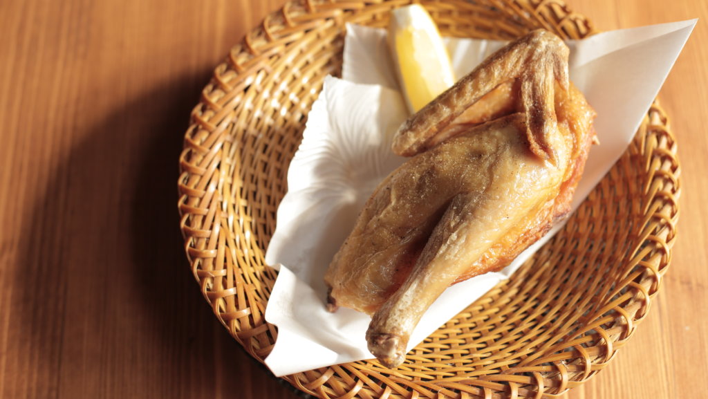 เมนูไก่เสียบไม้ย่าง Jidori Kushi Yaki ไก่ย่างรวม 8 ไม้ (570.-) ไก่ Jidori มีลักษณะคล้ายไก่บ้านผสมไก่ชน ปล่อยเลี้ยงตามธรรมชาติ เนื้อแน่น ไขมันต่ำ กลิ่นของเนื้อไก่มีความหอมแตกต่างจากไก่เนื้อทั่วๆไป ในจานนี้จะมีส่วนต่างๆ ของไก่ เช่น ปีกไก่ อกไก่ สะโพกไก่ ไก่สับผสมกระดูกอ่อน สำรับไม้นี้ต้องจิ้มในไข่แดงดิบก่อนรับประทาน ทุกไม้หอมการย่างถ่าน และ การปรุงที่แตกต่าง Jidori su-ege ไก่ทอดครึ่งตัว 290.- ไก่บ้านขนาดย่อมๆ หมักด้วยเกลือและทอดมาจนหนังกรอบ เนื้อมีความหอม เนื้อแน่น ไม่เละ แต่ไม่เหนียว เป็นอีกจานที่ขายดี
